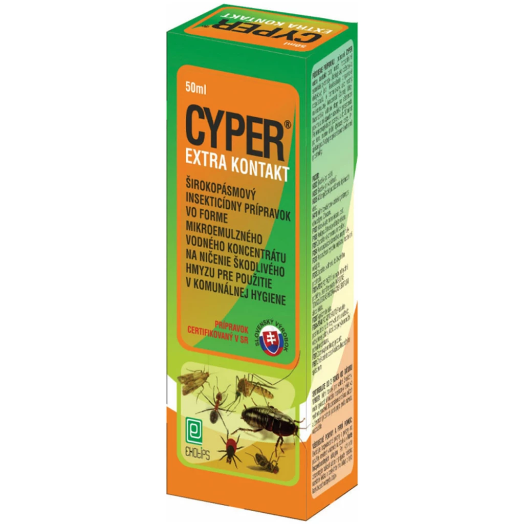 Cyper Extra Kontakt je profesionálny insekticíd na báze aktívnej látky cypermetrín, ktorá účinkuje ako dotykový a požerový jed, čím efektívne ničí široké spektrum lezúceho a lietajúceho hmyzu. Tento prípravok je vhodný na použitie v interiéroch aj exteriéroch, vrátane domácností, administratívnych priestorov, skladov, nemocníc, potravinárskych prevádzok a na ošetrenie izbových rastlín. Cyper Extra Kontakt sa aplikuje formou jemného postreku a poskytuje rýchlu ochranu pred hmyzom bez potreby častého opakovania.