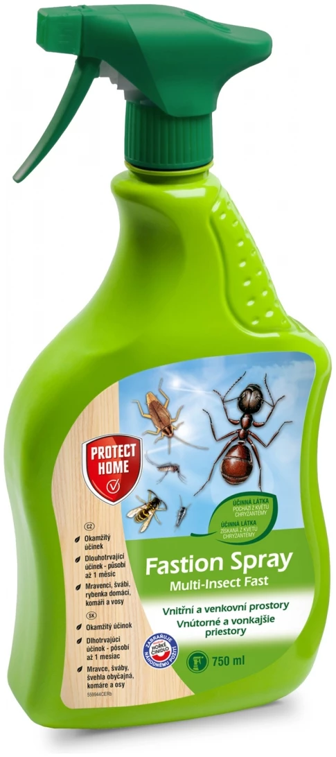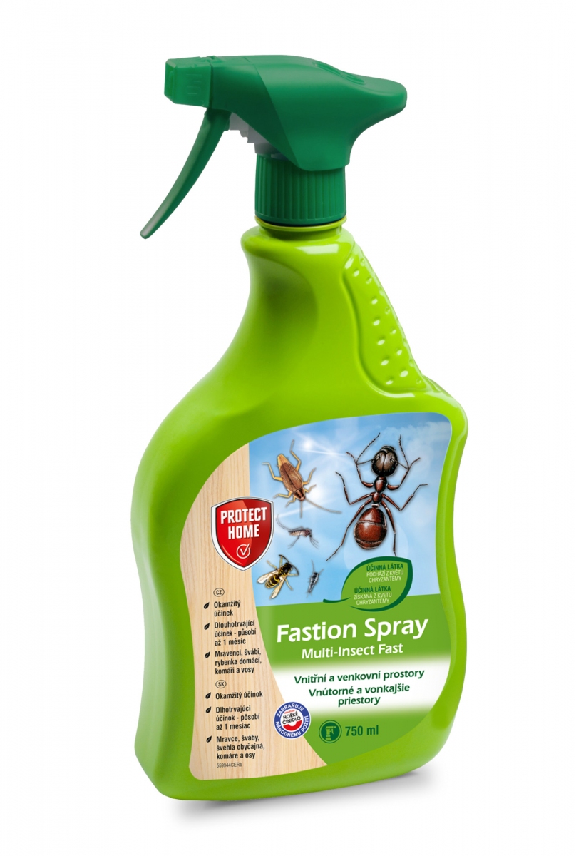 FASTION® Spray je vysoko účinný insekticídny prípravok určený na okamžité a dlhodobé hubenie lietajúceho aj lezúceho hmyzu vo vnútorných aj vonkajších priestoroch. Spoľahlivo likviduje muchy, komáre, osy, šváby, mravce, pavúky, rybenky aj iný nepríjemný hmyz v domácnostiach, skladoch, pivniciach, garážach či letných kuchyniach.